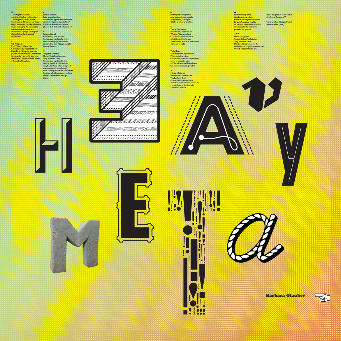 Heavy Meta is a design studio founded in 1990 by Barbara Glauber. The studio focuses on projects for cultural institutions, collaborating with artists, curators, and editors to create monographs, interdisciplinary exhibitions, information graphics, and identities. Barbara has an MFA from CalArts and teaches design at Yale and Cooper Union.